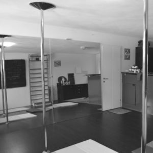 Wir trainieren im Keller. Es stehen vier Stangen zur Verfügung. Zwei 45 mm Gold, eine 45 mm Chrom und eine 50 mm Chrom Stange. Eine Wand ist verspiegelt, so fällt uns das einüben von Choreographien leichter.